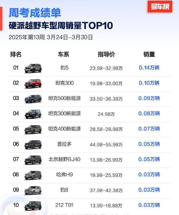 2024年第13周,硬派越野车型销量前五名中,新能源车型占据四席。