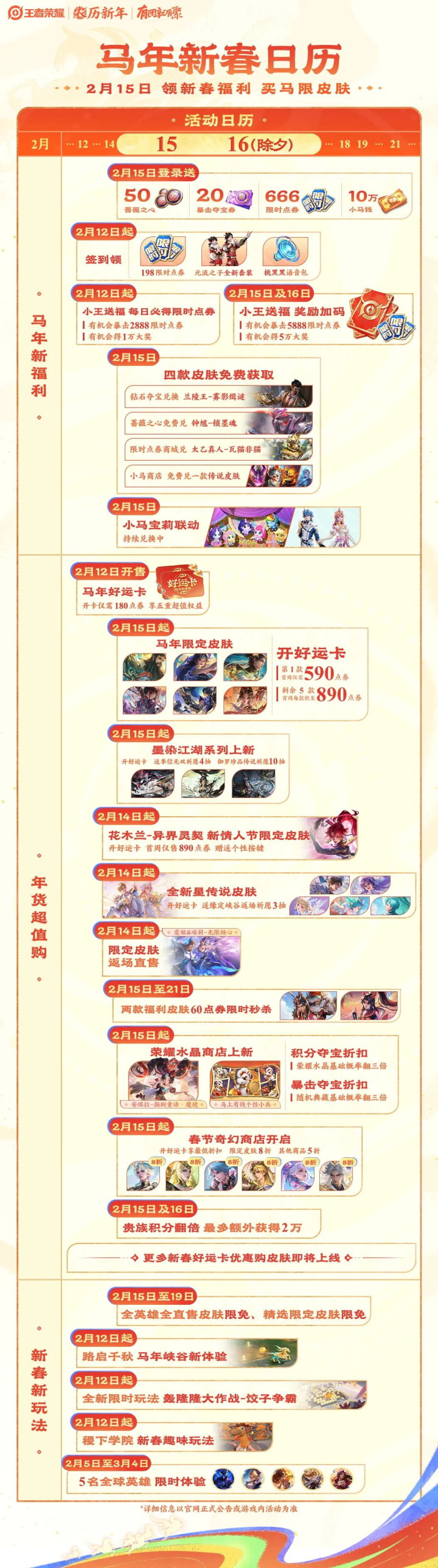 王者荣耀马年新春版块的日期,不错见下图,至极王人全。本次要点,在15号和16号。然后是好运卡的关系皮肤。