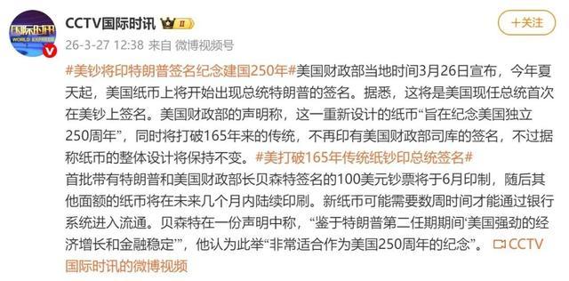首批带有特朗普和好意思国财政部长贝森特签名的100好意思元财富将于本年6月印制,随后其他面额的纸币将在异日几个月内赓续印刷。新纸币可能需要数周时候智商通过银行系统插足流畅。贝森特在一份声明中称,“鉴于特朗普第二任期技艺‘好意思国强盛的经济增长和金融沉稳’”,他以为此举“十分适合营为好意思国250周年的顾忌”。