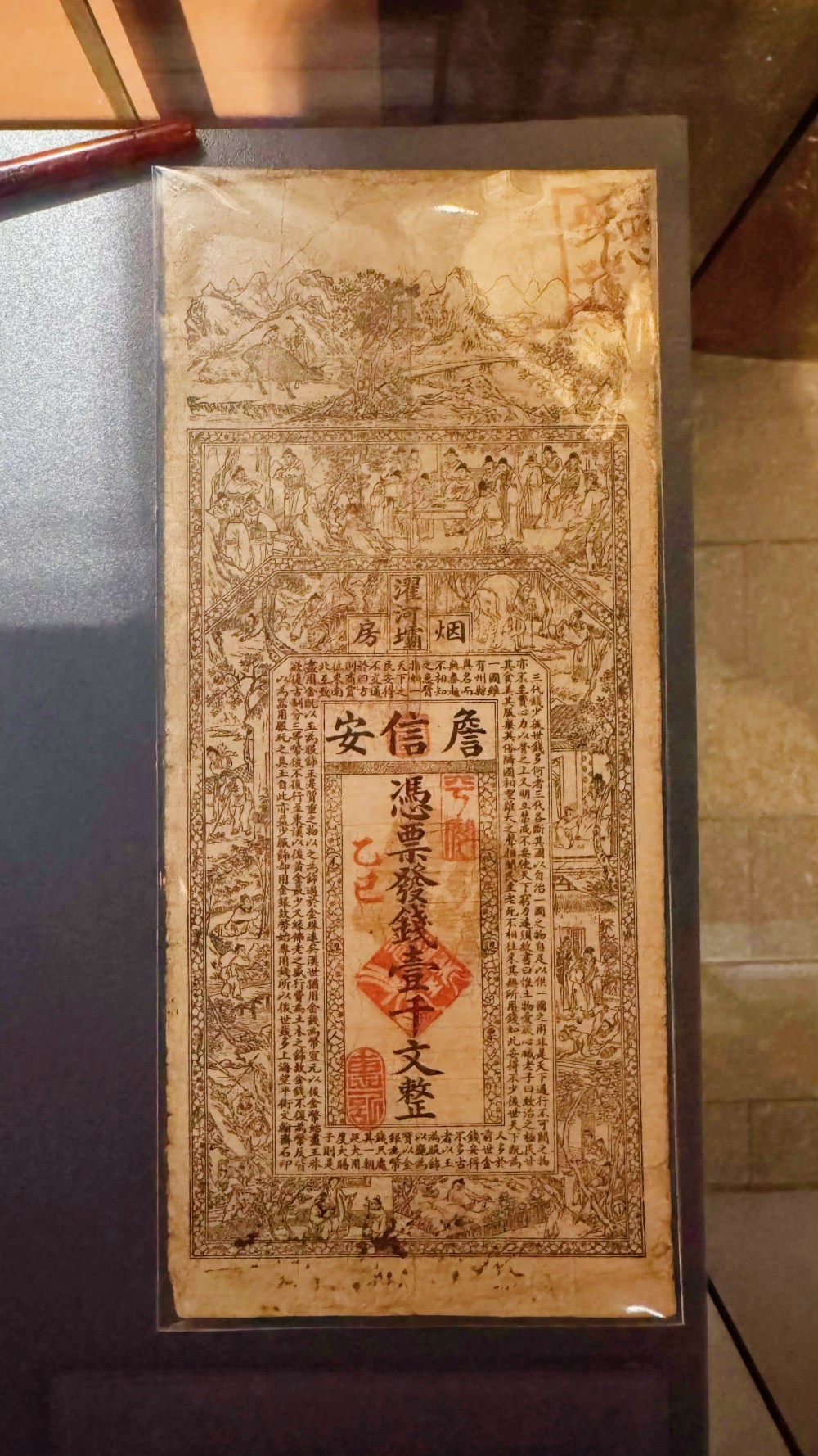 票面首段,蒲花邦畿水鬈曲入画;中段,濯水官宦商贸图景鲜美纯真;下书“凭票发钱一千文整”,价值正经;底部十孝图纹路细密,《资产歌》文字混沌。票背则了了注明“每月十五日兑银圆”,范例汇兑年王法。