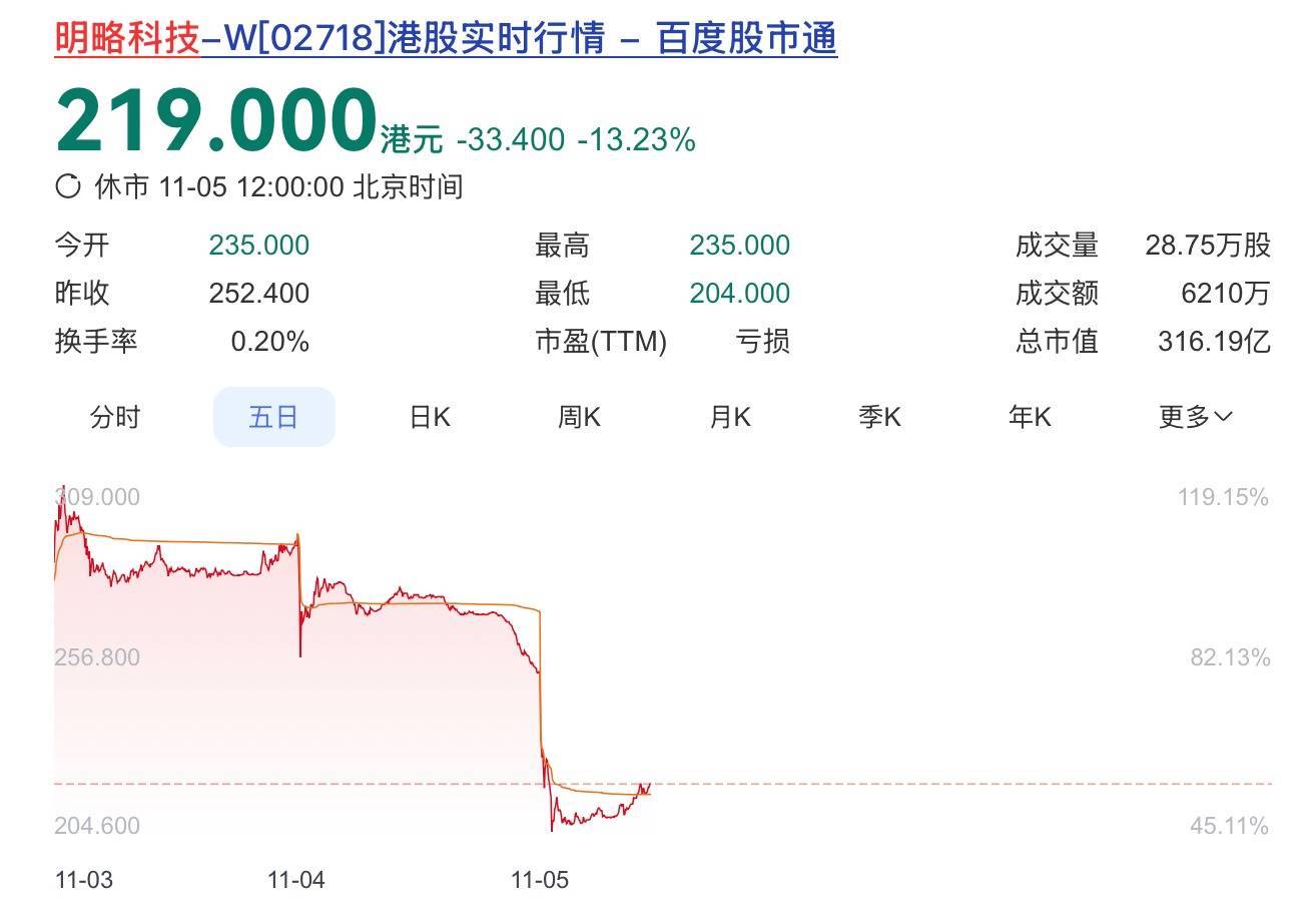 股价在随后两个来回日大幅回调。狂放11月5日午间休市,明略科技股价为219港元/股,市值约316.19亿港元。相较于开盘首日市值高点,两日市值缩水约110亿港元。